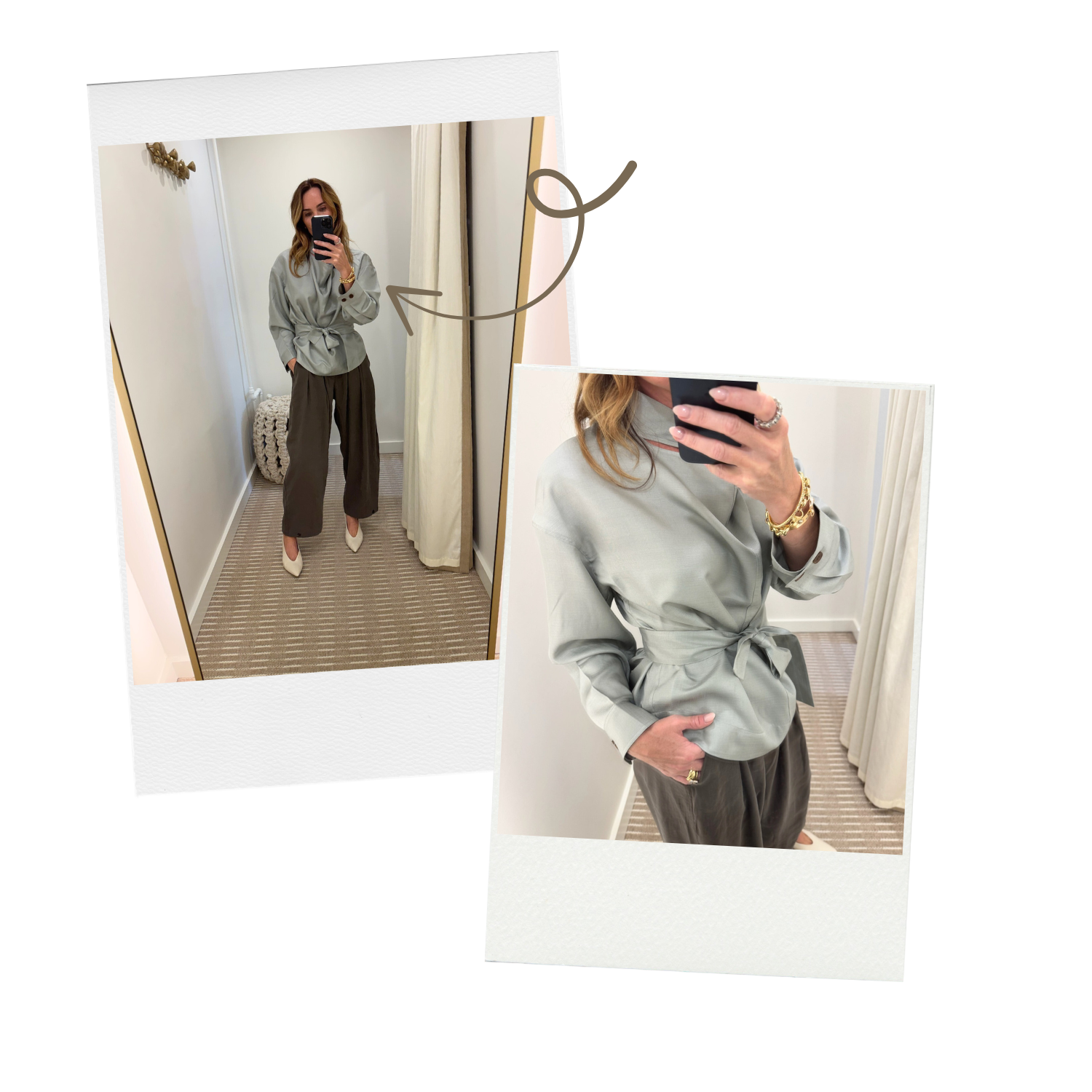 “Quite possibly my most favorite fall look in store right now. The pants are everything. They’re a viscose blend with elastic waist and the most flattering fit. Wear for travel or dress up with heels for a date night dinner. The top is a tissue fabric with cool belt and an asymmetrical button neck. The color is gorgeous!”