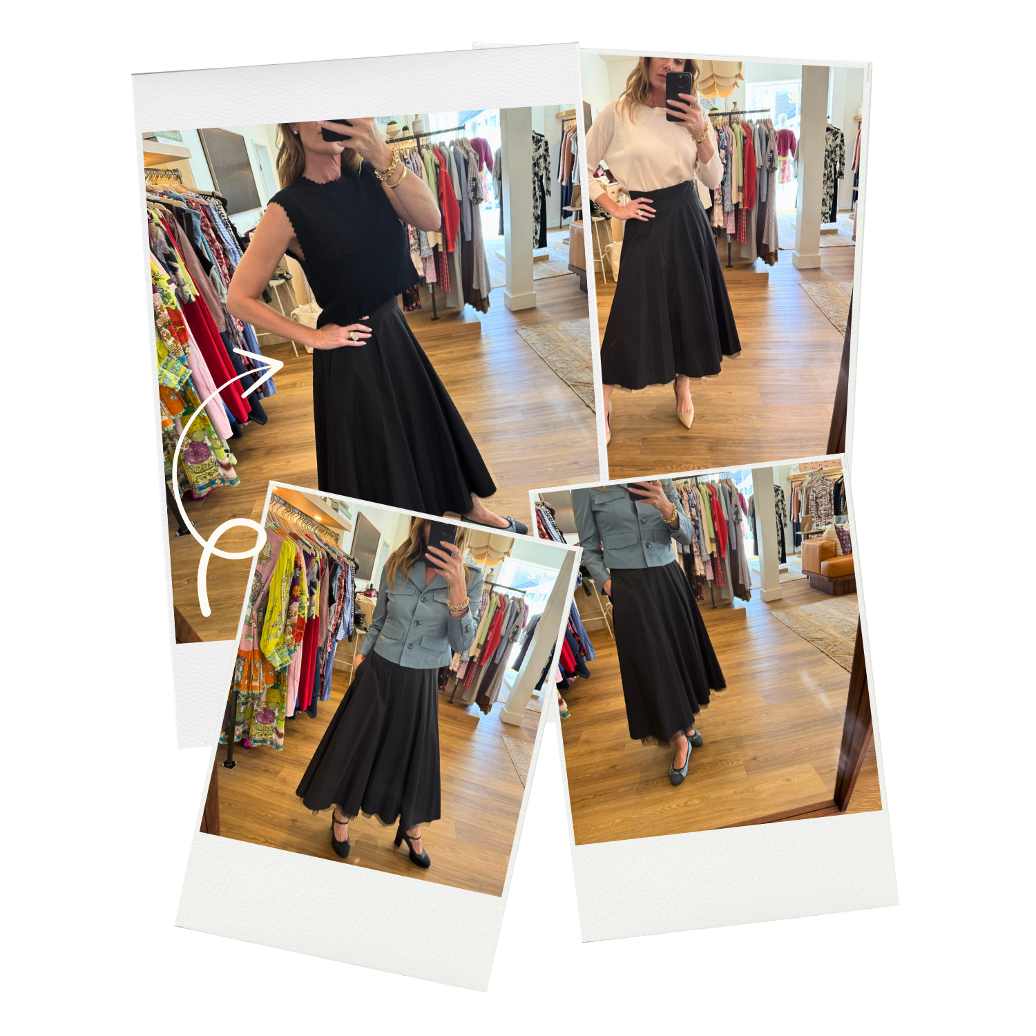 “I’m loving this fun swing skirt with tulle underskirt. Looks great with Chanel ballet flats or heels. I love the blue leather jacket paired back to black”